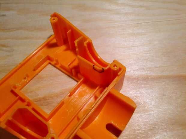 También debían recortar algún material correspondiente de la pieza frontal. (Ver segunda foto). Finalmente presentar una pieza del brazo de la manera tan el no presiona el interruptor cuando el brazo estaba abajo, pero se presiona en cualquier otra posición. Si utilizas un switch diferente que tenga que hacer cosas un poco diferente. Lo que realmente importa es que usted puede desconectar el cable de 0V cuando quieras. He utilizado mi trusty Dremel pero hack, archivo o derretir como mejor parezca.
