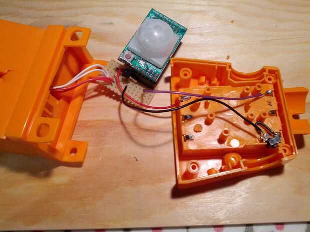 Nos estamos conectando a la batería en 3 lugares. En primer lugar que nuestra conexión a tierra - el alambre negro. Esto pasa por el interruptor principal (el brazo) a nuestra pequeña PCB. Va a la patilla de la izquierda en el sensor de PIR. Entonces tenemos 3V para suministrar el microcontrolador. Este es el cable morado. Va a la patilla de la derecha. Por último tenemos 4.5V a suministrar sólo los LEDs. Se conecta a los cables rojos que los LEDs en sus pies.