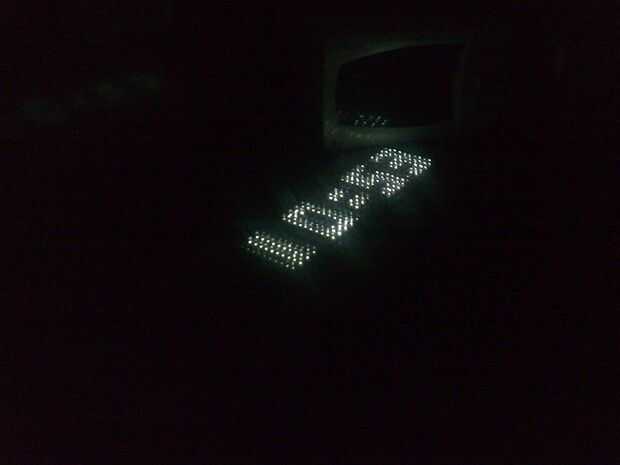 este es un módulo de LED RGB de 8 x 8, por 4 x 74HC595N cambio registros controlados por un Boarduino (clon de Arduino que se puede utilizar en un protoboard). Los datos de tiempo están de un IC de reloj de tiempo Real DS1307.La pantalla es hacer sal