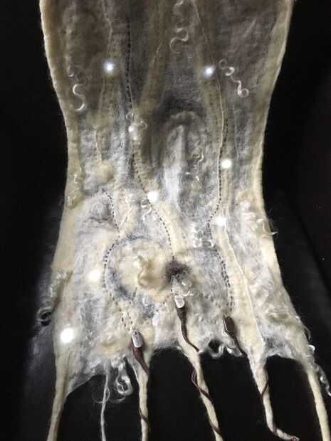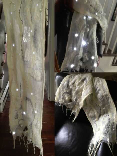 La bufanda se ilumina a través de toda su superficie en respuesta a cómo se mueve la persona que lo usa. Mi "interruptores de franja" son tan sensibles que incluso una pequeña brisa produce el efecto visual de luces parpadeando y brillantes. Todo aquí se basa en conexiones mecánicas (sueltas) sin ningún tipo de codificación o computación.