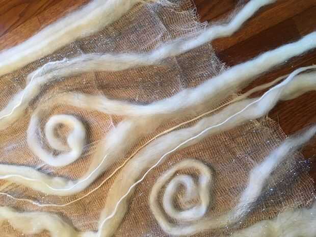 Esta bufanda es de fieltro nuno y utilicé un paño de queso en lugar de la tradicional seda que realmente salió muy bien. Puso el patrón que quería con la mecha en el paño de queso, añade mi hilos individuales que había hecho girar de interés visual y algunas cerraduras y fibras de Angelina para que sea todo bonito y brillante.