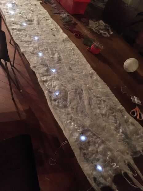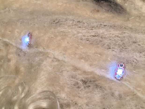 Luego cosí el LED en la bufanda. Yo sabía que quería tres circuitos independientes al final para agregar más independiente "movimiento" y oscila en el diseño, por lo que corrí simplemente tres líneas de circuitos paralelos en un patrón ondulado en la longitud de la bufanda. He comprobado también continuamente con cocodrilo clips para asegurarse de que estaban trabajando el LED y orientado correctamente... solo decir... no sería la primera vez que metí para arriba...