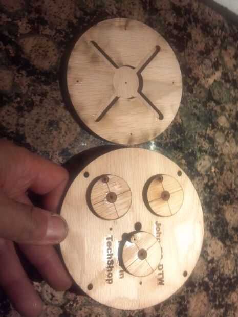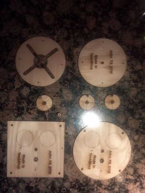 Esto es 1 prueba para mi proyecto de rueda de Ginebra. Así que me gustaría utilizar alguna madera de desecho y corte en el cortador del laser de Epilog. Voy a usar pegamento para unir el eje del conductor y la rueda de tracción.