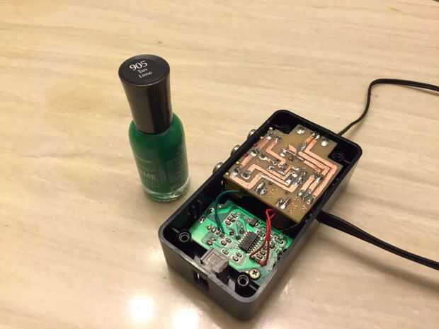 Para sellar cosas y proteger los rastros de cobre, utilicé esmalte de uñas verde. Acabo de recibir el material más barato que estaba cerca del mismo color como máscara de la soldadura de la Junta del sensor.