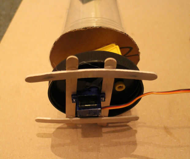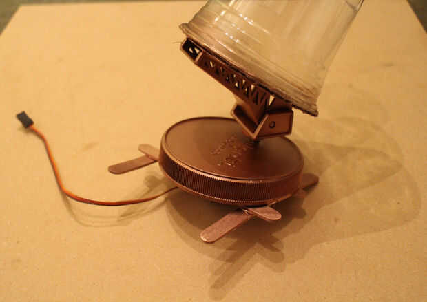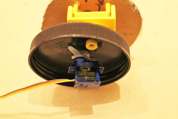 5. pegamento servo motor los brazos a la parte inferior de la tapa de Tupperware.