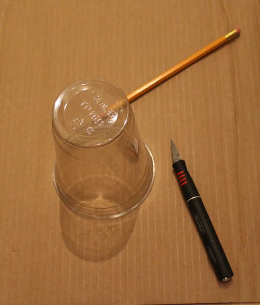 3. cortar ranuras en taza plástica para pajitas. También puede hacer una "puerta" en la taza plástica para recuperar sus canicas (... o granos).
