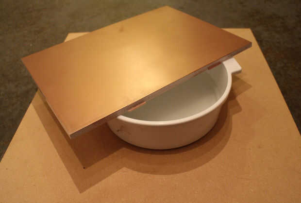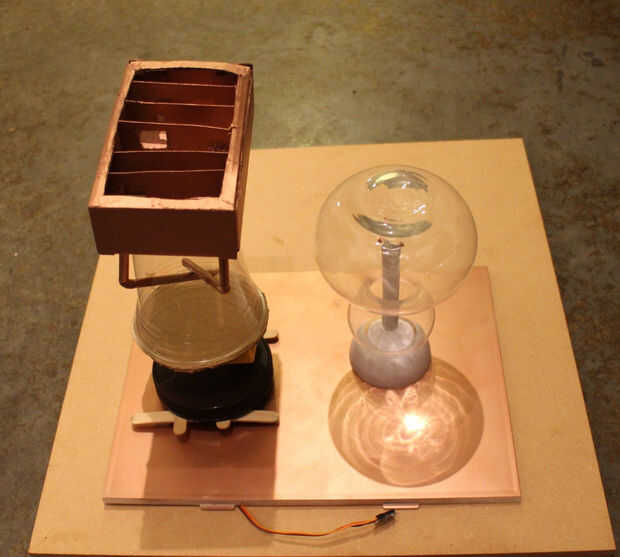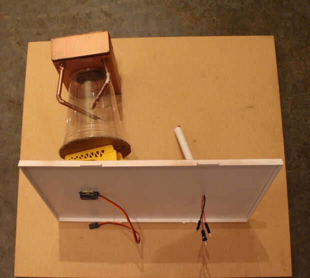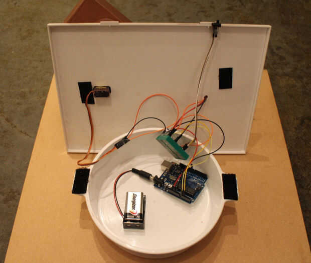 Rienda suelta a su creatividad e ingenio! En este diseño, un recipiente de Tupperware sostiene (y oculta) la electrónica. Ya que quería una base rectangular, opaca, en lugar de usar la tapa de Tupperware, participó de la caja de un desecho Impresora/Escaner y aerosol pintado cobre.
