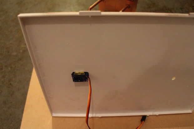 3. medir el tamaño del motor servo y corte un agujero en la base (sólo el cuerpo del motor servo, mantenga los brazos sobre la base de montaje). Servo motor cuerpo (y cables) a través del orificio, pegamento caliente que palos de paletas a parte superior de la base de empuje.