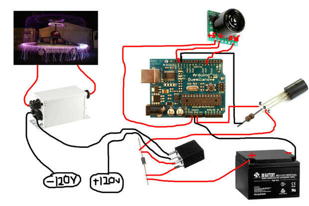 esto es una bobina de tesla mini muy barata hecha de cosas tenía por ahí.Cómo funciona: "electricidad fluye en C1 hasta que un voltaje alto se ve a través de G1. Cuando este voltaje es suficientemente alto, una chispa salta a través de la brecha y pe