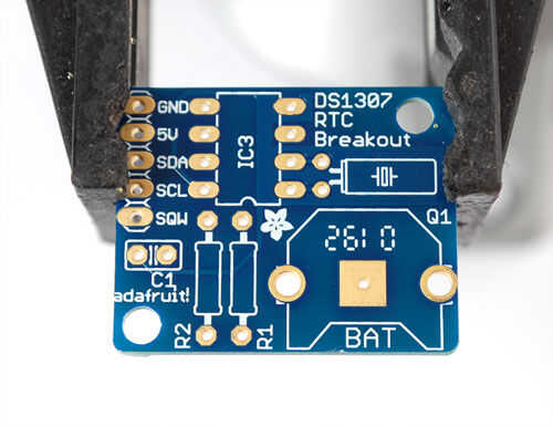 El reloj de tiempo Real DS1307 Adafruit breakout Junta kit es precisamente eso; un kit. Todos los componentes están incluidos y es muy sencillo de montar con un poco de luz de soldadura. Adafruit proporciona instrucciones completas en http://www.ladyada.net/learn/breakoutplus/ds1307rtc.html. El kit incluye una pila de moneda de litio de 3 voltios que mantendrá el reloj funcionando durante años.