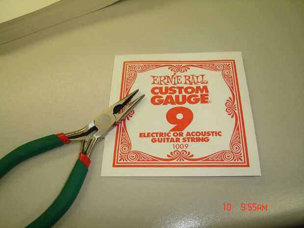 2 cortar un trozo de la guitarstring (aprox. 4") y enrollar un extremo de la otra con sus alicates de punta. Esperemos que esta voluntad proctect ojos si en caso alguien obtiene clavó allí.