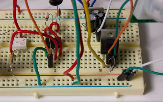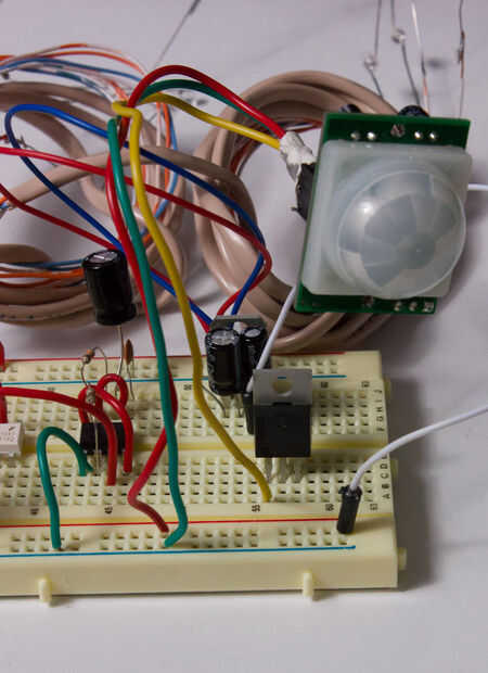 Estoy usando un sensor PIR de Parallax REV A que recogí de RadioShack último Halloween. Conectar los pines positivos y negativos para el riel de 5V y el carril de tierra respectivamente.