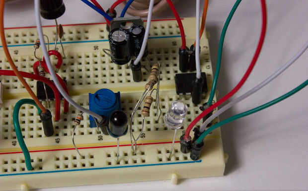 - Conectar el potenciómetro de 10kΩ a través de 5V y tierra de lluvias y conecte la patilla central del potenciómetro a la entrada de la inversión (-) del amplificador operacional 741. Esto es lo contrario del diagrama en el paso 5 de la original Instructable. Es intencional, ya que el temporizador 555 necesita un disparo bajo.