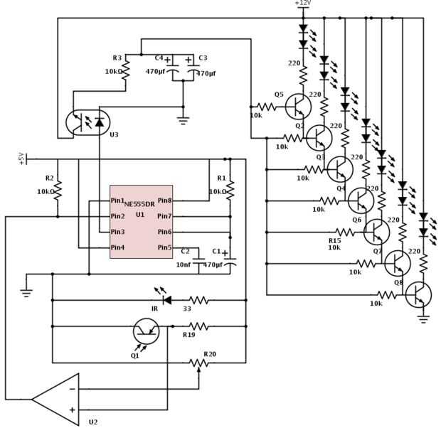 - Conecte el fototransistor IR en la misma forma, pero sustituir una resistencia 10kΩ para las 3 resistencias de 100Ω. Conecte el punto central del fototransistor y la resistencia de 10kΩ a la entrada NONINVERTING (+) del amplificador operacional 741.