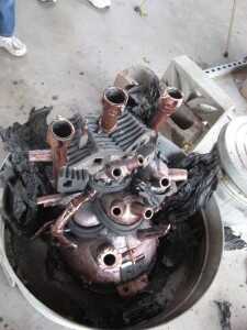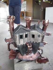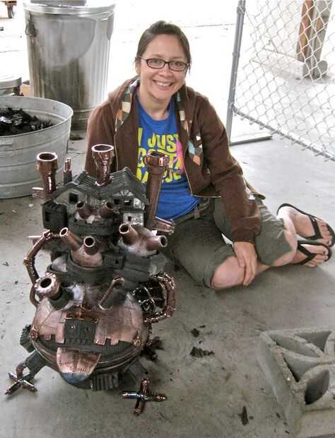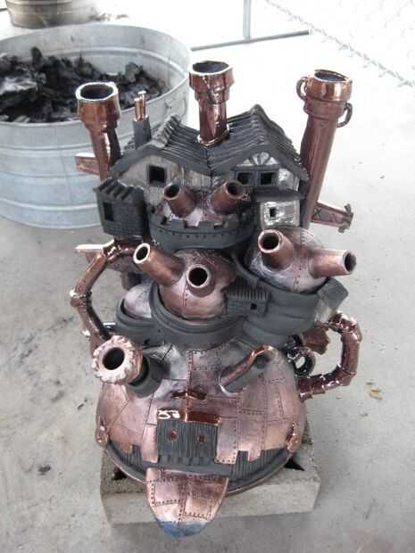 He pintado varias partes de la obra con esmaltes de raku. Algún lugar muy brillante, otros donde crepitante y otros como mancha de aceite. Esto trae la sensación de steampunk a la pieza.