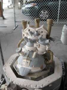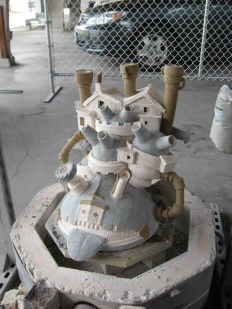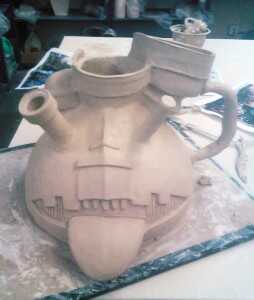 Tuve que planificar la pieza muy cuidadosamente para que no se a grande para caber en nuestro horno de Raku y también tuve que tener en cuenta que teníamos que recoger de alguna manera esta pieza fundida caliente de arcilla una vez que se ha hecho el disparo y movimiento que su reducción puede. Hice algunos mangos para los lados y la espalda que parece ser pipas y que complementan el estilo del castillo. No pude encontrar buenas fotos de cada lado del castillo para saber cómo reproducir exactamente todos los detalles así que bastante hice algunas cosas para arriba pero el espíritu del castillo estaba definitivamente allí.