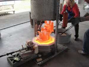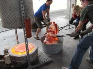 Generalmente un pedazo de Raku es tan pequeño no es un problema para sólo recoger con las pinzas pero este castillo era muy grande (el más grande que han intentado poner en el horno de Raku) y necesitan tres personas para sacar de horno y coloque en el hoyo de la arena preparado donde luego fue cubierto con una metal basura. Normalmente le pones la pieza en una lata y luego la tapa sobre él para el proceso de reducción, pero en este caso, utiliza un cubo para la base con arena y periódico dentro y luego pone la lata en la parte superior.