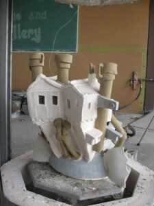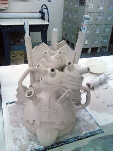 Comencé el proceso de construcción por lo que la base del castillo y la parte superior en dos piezas separadas que podía asegurar que era muy estable y no demasiado pesado. Planeé en pegar después del proceso del Raku . Comencé con la mano tirando las formas del tazón de fuente y los cilindros de la parte superior e inferior y luego con el tiempo, añadiendo piezas hechas a mano. Usé papel enrollada para las tuberías por lo que mantenían su forma.