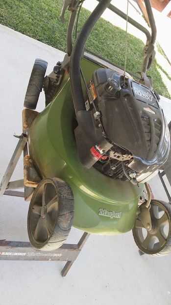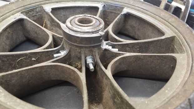 Como se puede imaginar una rueda de recambio para una podadora de envejecimiento es caro y difícil de encontrar. Así que usando unos tubos, tuercas y pernos reparar el eje en ningún momento y muy barato!