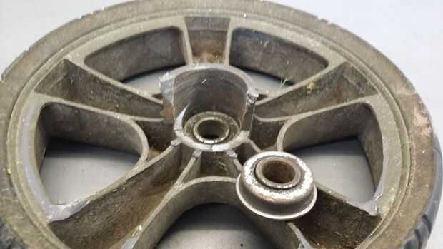 Destruyó el centro de la rueda de mi rueda cortadora el fin de semana girando la podadora mientras que la rueda estaba en un bache pequeño al lado de un borde de hormigón que resulta en la mayoría de los de la parte interior del cubo está arrancado.
