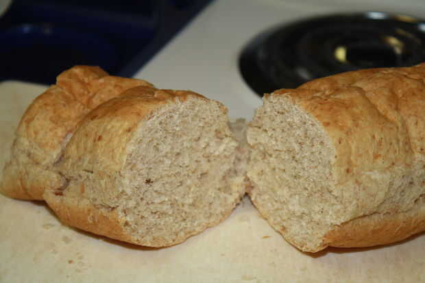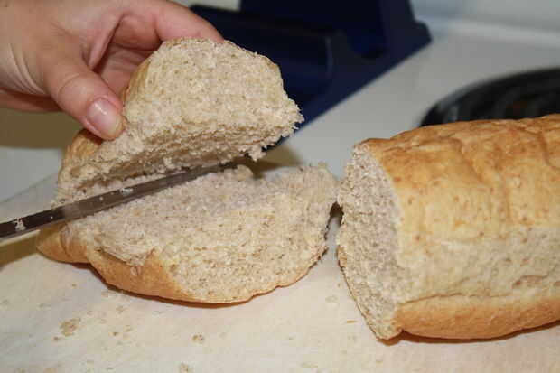 Cortar el pan en tres o cuatro piezas y luego por el medio.