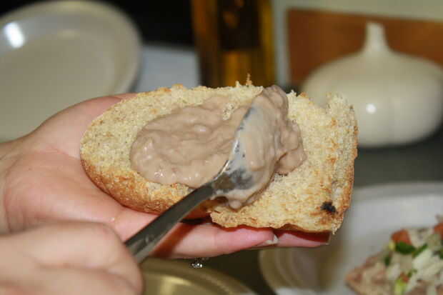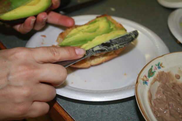 Cuando se hace el pan en el horno, empezar con untando frijoles o aguacate en el pan. (Su elección)