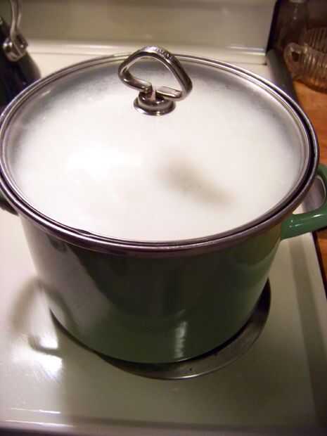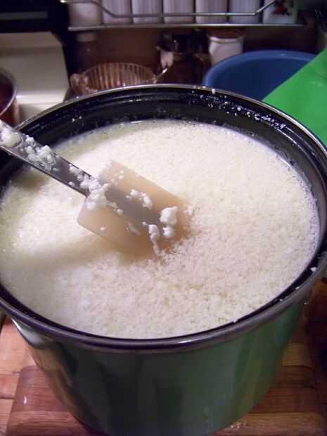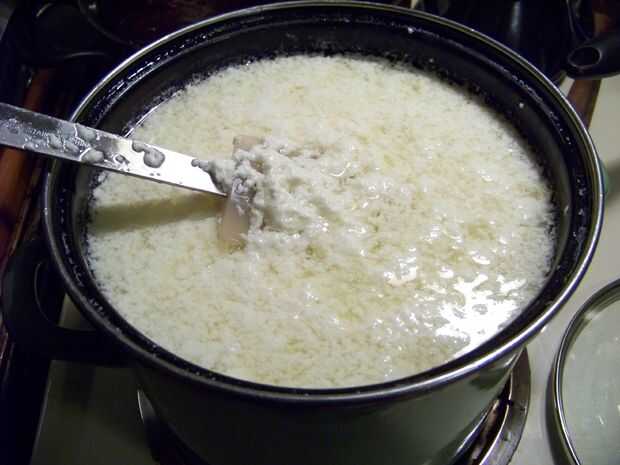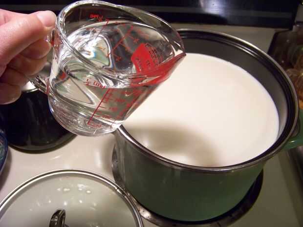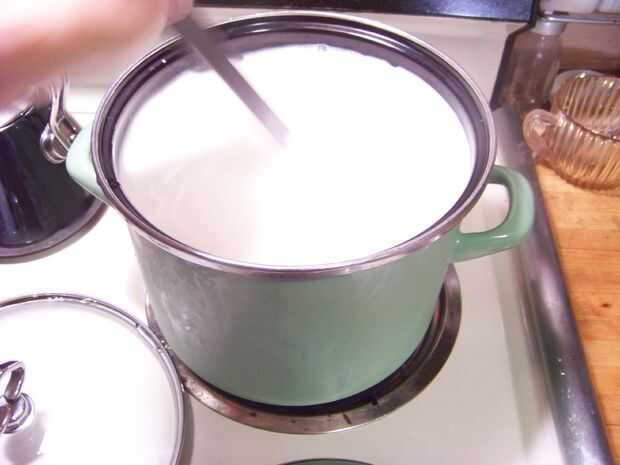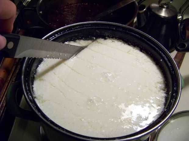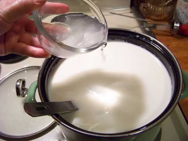Tomar fuera del fuego, agregar el cuajo disuelto y agitar vigorosamente durante 30 segundos. Cubrir y dejar reposar durante 5 minutos.