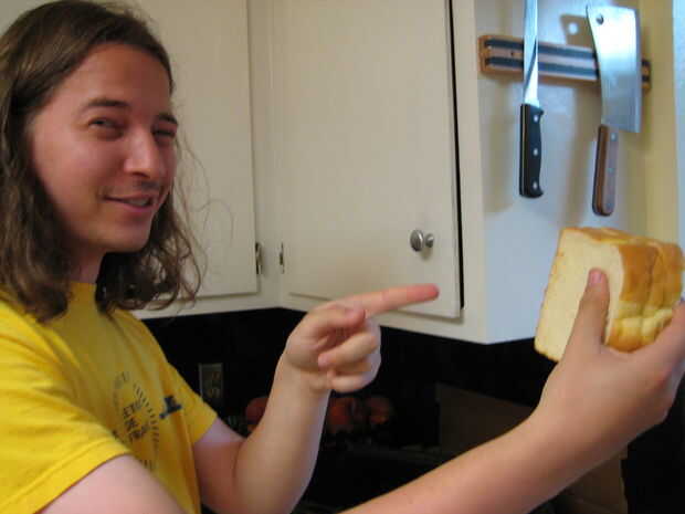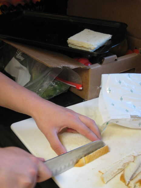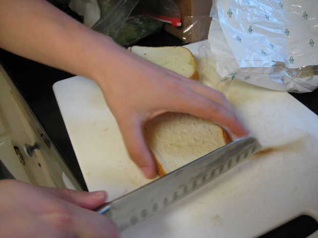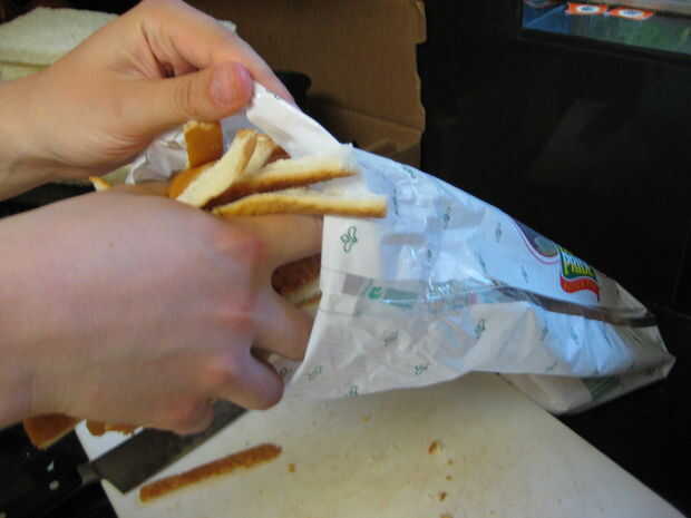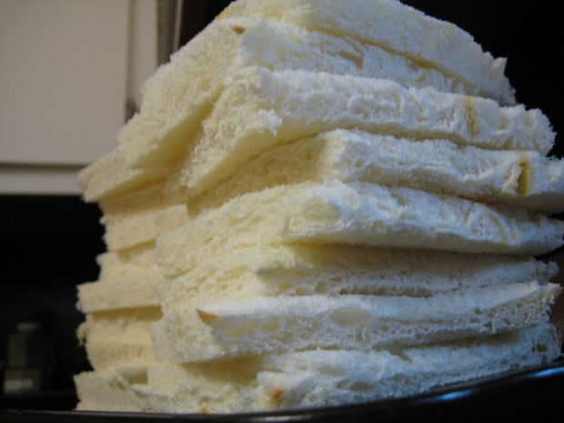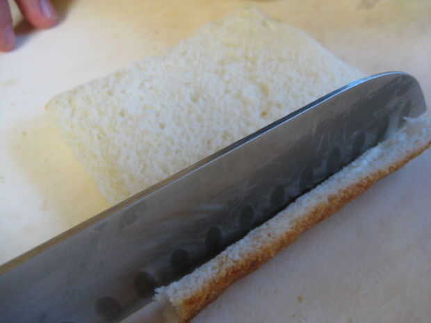 Quitar la corteza de cada rebanada de la hogaza entera de pan (excepto los extremos).