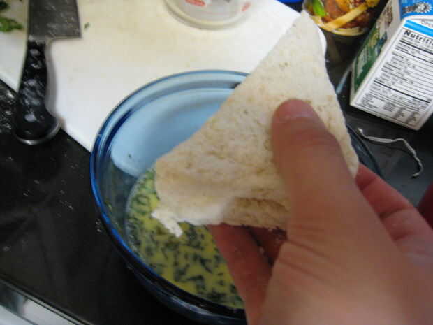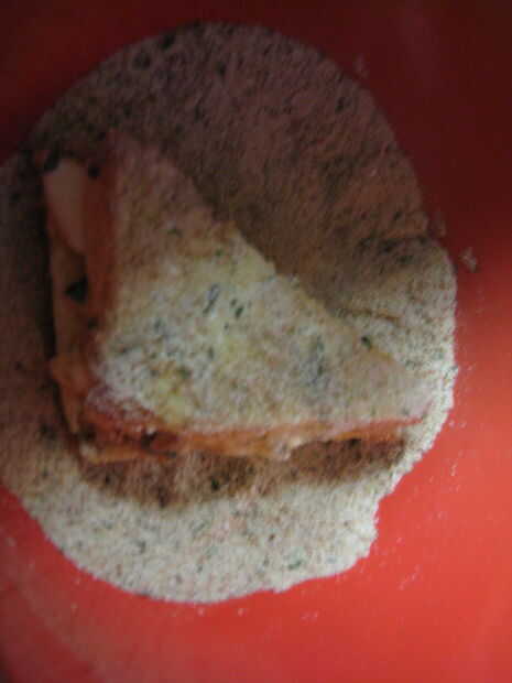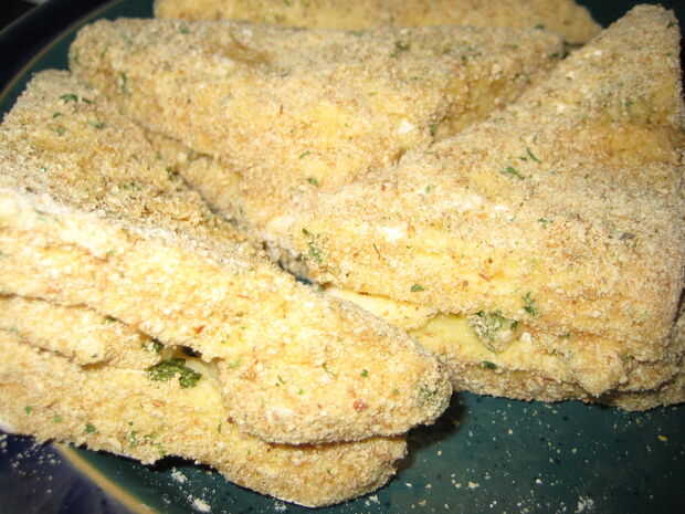 Uno por uno, capa de los triángulos de mozzarella en la mezcla de huevo y luego en las migas de pan hasta que todos están cubiertos.
