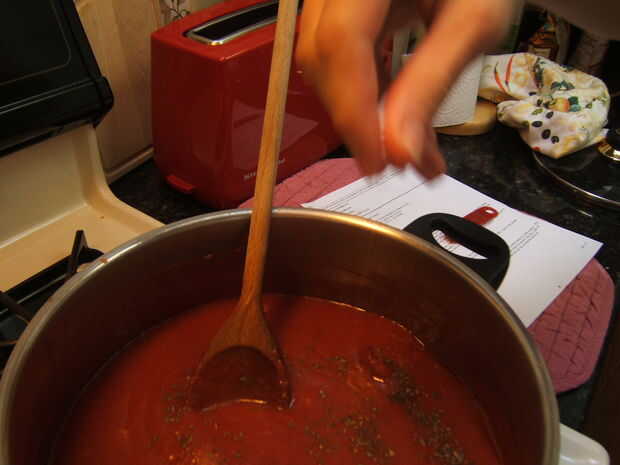 Empezar a calentar un poco de salsa marinara sobre una baja a mediana llama... o simplemente puede engañar como lo hizo en esta ocasión y calentar en el microondas.