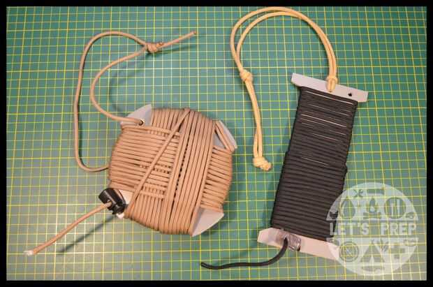 Como se puede ver en las fotos arriba que hay un número de maneras me dirijo a los problemas. Al principio (hace 15 años en el ejército que era) yo simplemente envuelto cordón o cinta alrededor de pequeñas tiras de cartón. Cartón sin embargo no es el más rígido de materiales y no le gusta el agua. Años más tarde un traspiés en un nuevo material (nuevo para mí al menos), hojas de PVC de la espuma que donde es fácil de trabajar, resistente al agua, relativamente rígido pero flexible y probado que en combinación con un simple cable tapón/cerradura. Probé unos diseños diferentes (marca 2 y 3 que se puede ver arriba) hasta que decidí ir con este diseño que ofrece un perfil plano, sostiene 30'(10m) de paracord y sobre 10'(3m) de cinta adhesiva.