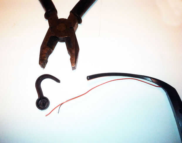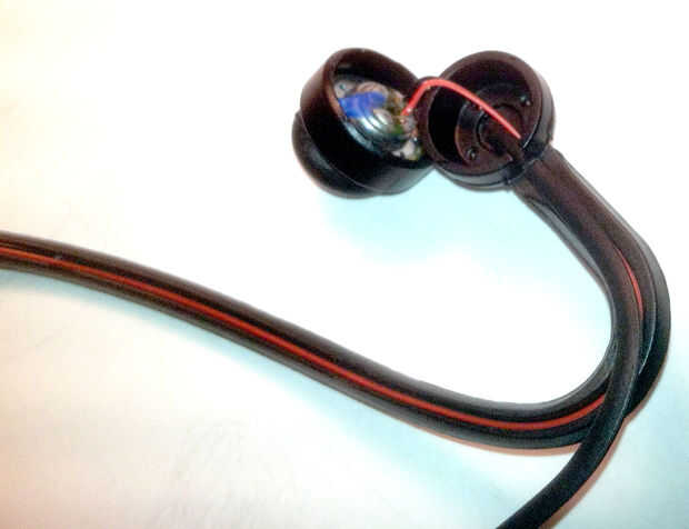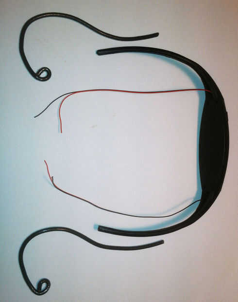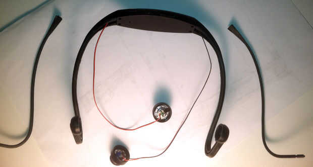 En este punto, usted debe tener una buena vista de los cables de corriente abajo de la diadema y las "almohadillas" que todavía se unen mediante soldadura a los cables. Usted debe ver 2 cables corriendo fuera de la zona de la izquierda y derecha de la venda. Entonces necesitará cortar el los auriculares para que queden solamente los cables.