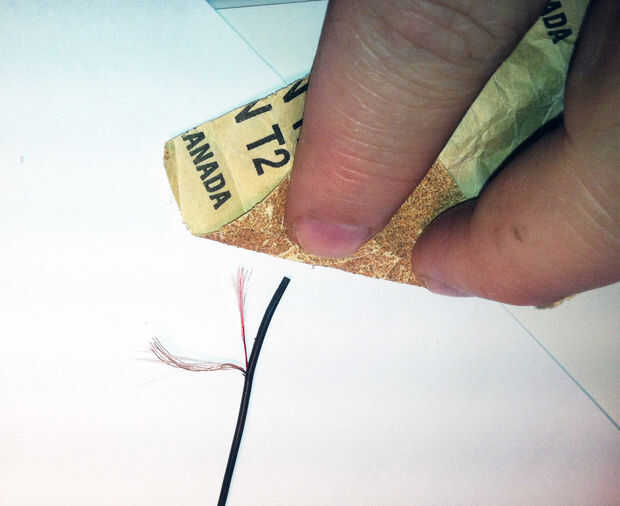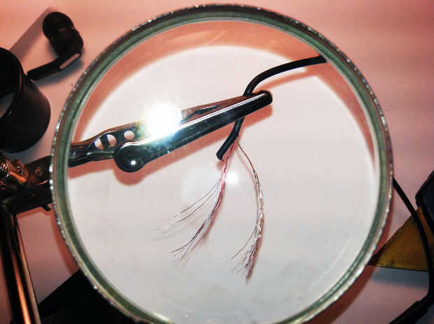 Después de decapar la chaqueta, probablemente verás dos colores de los cables. Mía miró a) oro y plata b). Parece que son dos cables sin aislamiento. No tiene sentido. Realmente los cables están aislados. Sólo son esmaltados o lacados. para conectar a estos cables, raspar, papel de lija o quemar el aislamiento. Buena forma de pensar es pretender que el esmalte del alambre es como un plástico aislante. Con esto en mente, usted sólo querrá "tira hacia atrás" de parte del extremo del alambre. Se desea que el resto del alambre a permanecer aislados. Utilicé papel de lija para quitar los extremos de los cables de mi.
