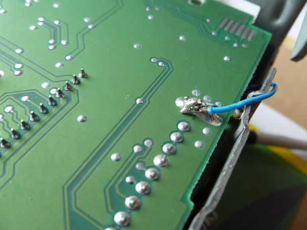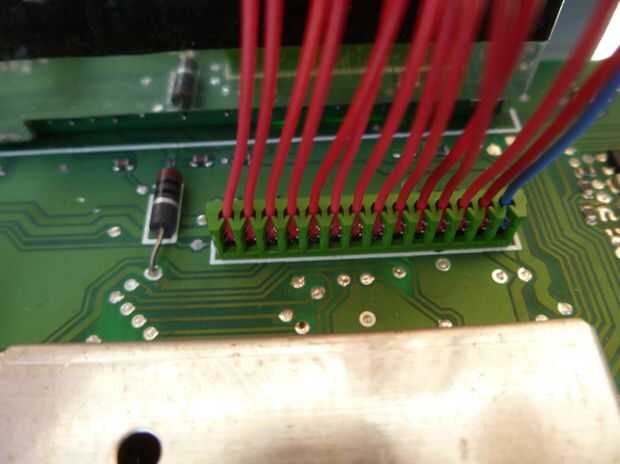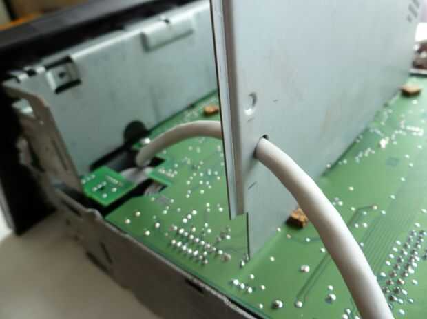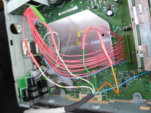 Usando un UTP CAT5 cable es muy útil como el sugerido en el post. Explotó con el alambre en la parte inferior (porque es la única parte donde hay espacio suficiente!). Por lo tanto tenía que perforar un agujero de 6mm en la parte inferior y retirar con cuidado las rebabas de metal! Asegúrese de que usted no cortocircuito nada! Incluso no derramar ninguna gota de soldadura. Si reside en su RACDU, no quisiera estar en su asiento conductor cuando la radio a dejar de jugar.