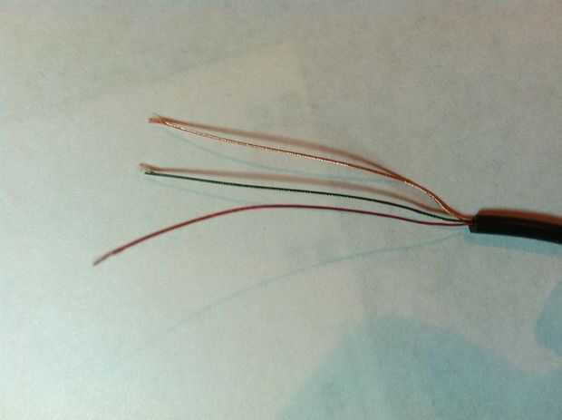 Tira de la cuerda (a la longitud necesaria) y examinará los cables. Debe tener un alambre color cobre y dos hilos de otros colores (en mi caso, verde y rojo). Tome su encendedor y quema la parte pelada de los cables - esto remueve el aislante que los cubre.