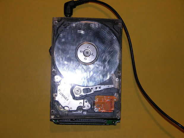Desatornille los tornillos de la tapa del disco duro, poner todo el disco duro en la bolsa del congelador y quite la cubierta. Puede attatch la ventana en un número de maneras diferentes. Lo primero que probé y no pudo, era taladrar el tornillo a través de la plástica y tratando de tornillo en. La razón que esto no funciona porque no al ras de donde se atornilla en la cubierta de metal que se me quitan, tenía realmente una superficie levantada donde el eje era (como la mayoría de discos duros). Para solucionar este problema ponga los tornillos en el disco duro, pero no tornillo les en todo el camino, de esta manera actuaban como bandas y levantó el plástico lo suficientemente lejos para que no estaba tocando nada dentro. Sin embargo, esto no sostener el plástico, y había una gran brecha entre el plástico y la caja de disco duro. Para solucionar ese problema llenó el boquete con pegamento de Devcon multi propósito.