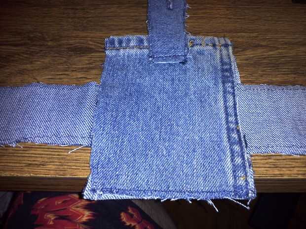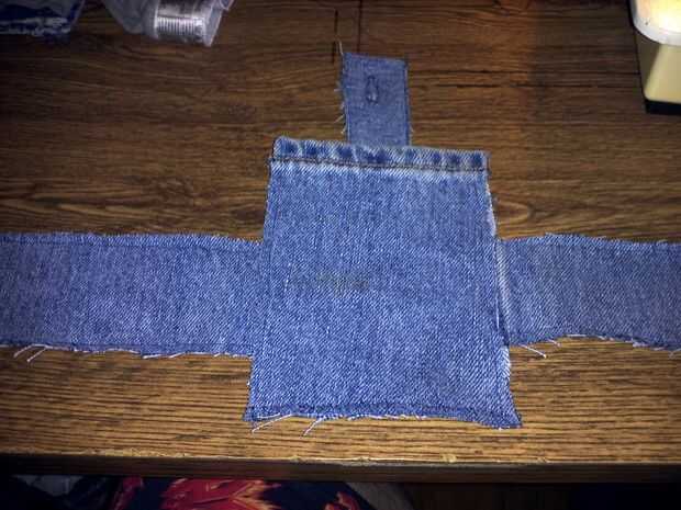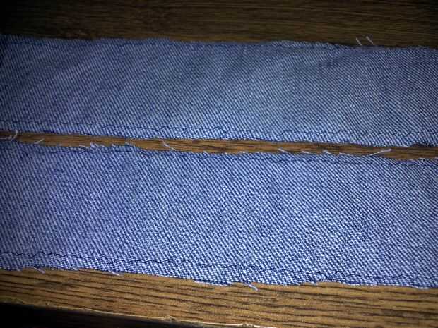Las cintas fueron cortadas de otra pieza de mezclilla. Se ha añadido una puntada de zig-zag para los 4 bordes para evitar que se deshilache.