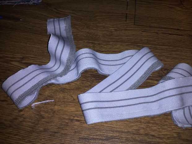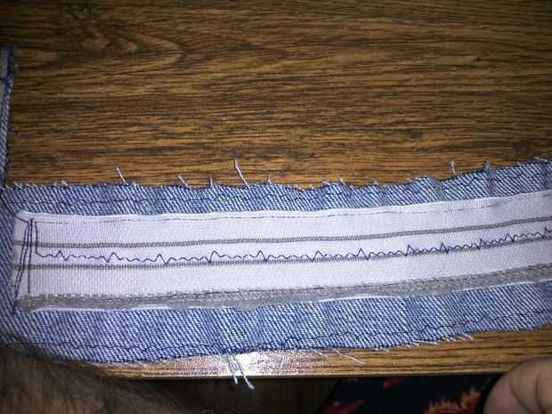 corté dos pedazos de venda elástica de la cintura de la ropa interior. Une en extremo a la parte posterior de una correa y decidió que quería poner fin. Tenía que asegurarse de que había holgura en el dril de algodón, por lo que cuando he añadido el elástico sería elástico. Después de coser hasta el segundo final, estiró el elástico y cosido todo el camino abajo, abajo, a mitad de camino a través de y puesto un gran zig-zag puntada todo el camino por el medio. Repita para el otro lado.