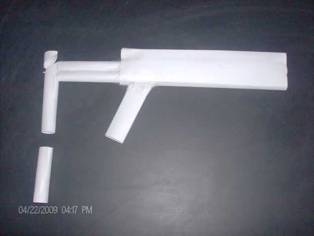 Tome el tubo más pequeño y cortar por la mitad. Pegar los dos en los orificios de la parte inferior dos y la cinta una vez que lo tienes también la longitud desea. Su última pieza en la parte posterior de la cinta el demasiado rollitos que sobresalen. Luego corte en ángulo en la parte superior. Cortar el rollo a la longitud de la manija. Cinta cada cosa!!!!!!