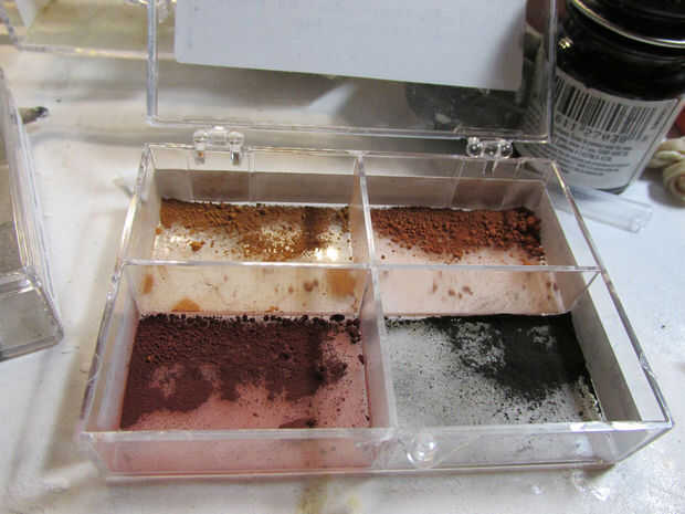 Todas las pinturas que usé fueron modelado acrílico pintura. El blanco es blanco, brillante de X-2 Tamyia modelo aire de la tierra (marrón, verde y gris).
