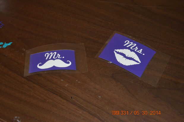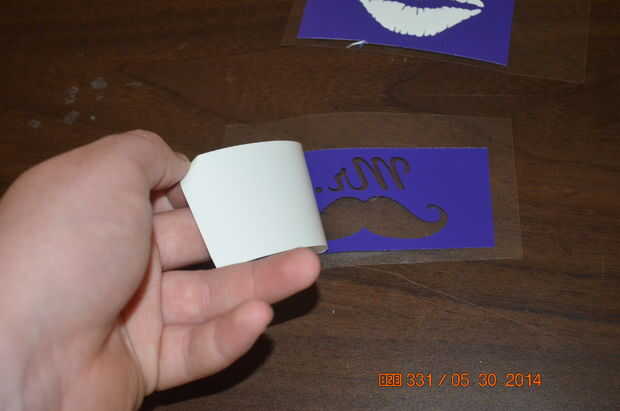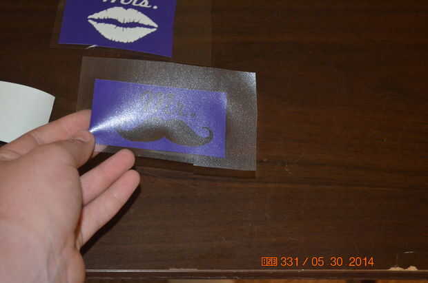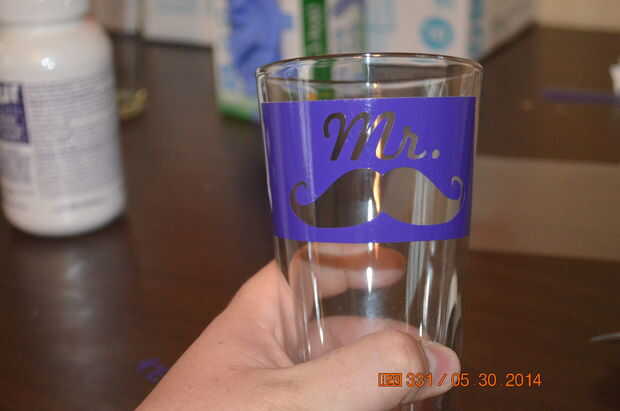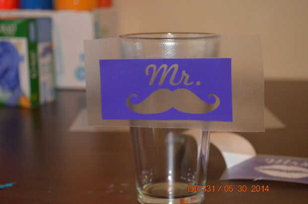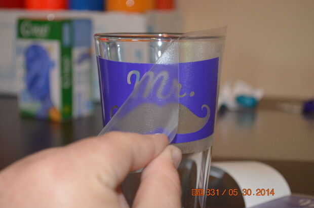 Después de que la tienes en la cinta de transferencia, cuidadosamente pegarla al cristal. Asegúrese de que esté recta. Una vez que llegue allí, frotar muy bien y luego retire la cinta de transferencia, dejando la plantilla de vinilo en el cristal. Oh y asegúrese de que no te las burbujas! Algunas burbujas en las áreas en blanco son bien, pero no puede ser cualquier burbuja en/alrededor de las letras o imágenes. Si hay burbujas allí, la crema de grabado se fuga debajo de la plantilla y lugares que no deben ser grabadas.