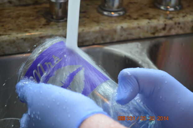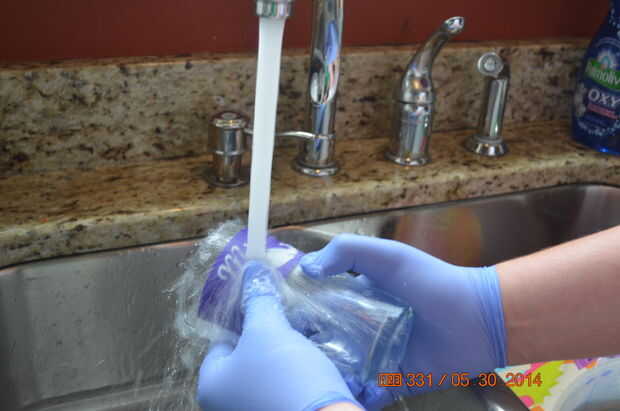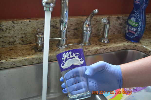 Con cuidado llevar sus gafas en el fregadero. Uno a la vez, enjuague la crema de las gafas. Ya que usted todavía los guantes, utilice sus dedos para frotar la crema porque puede ser terco para salir a veces.