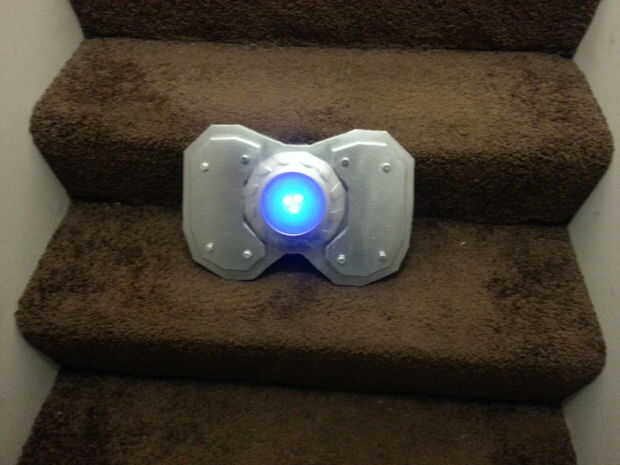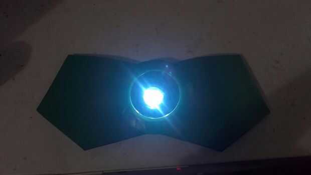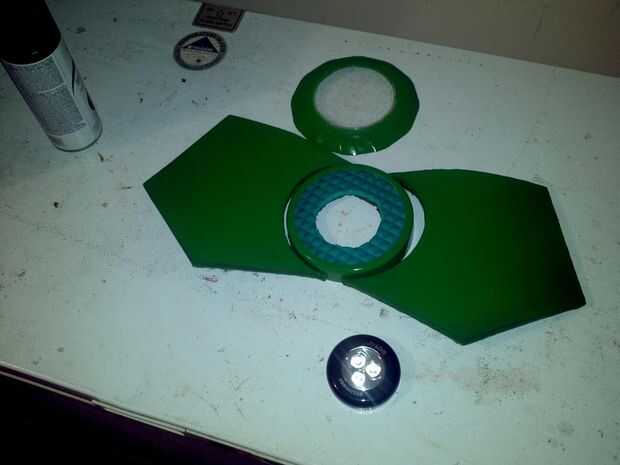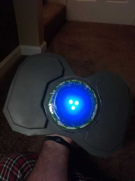 Tomé la linterna grande base aparte y usar el borde para ayudar a casa la espuma y la pequeña luz de LED interior. Cortar un círculo fuera de la carpeta azul y me había metido debajo del borde de la carcasa. (Asegúrese de hacer que la luz extraíble para que puedas cambiar las pilas y empuje el centro para encender. Yo use un pedazo de cinta adhesiva y une de un lado a otro y un mango pequeño para ayudar a tirar de ella cada vez. Probablemente mejor manera de hacer eso, pero este funciona para lo que necesito para. A flair a la luz, pegué una placa plástica clara con un diseño interesante para que se vea más como una batería. crear su diseño de pecho, añadir sus pernos en el pecho el look metal añadido y lejos de la pintura.