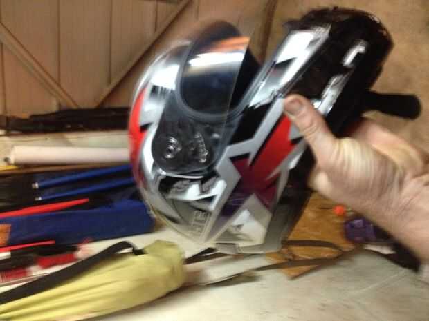 empecé con el casco. pintado plata y comenzó agregando lights.some del almacén del dólar, pero luego más 12 v luces que tenía que alimentar con la batería de la motocicleta. luego debían construir los pies para poner la batería allí y hacía más de 10 pulgadas.