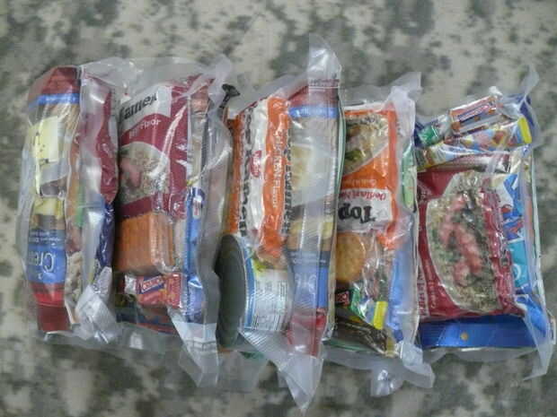 *** Paso 3... romper la vacu-chupar y shrink-wrap sus golosinas en buena Li ' l paquetes... Enjuague y repita... * Nota... no te olvides de pinchar sus paquetes de arroz, papas, fideos y galletas w/una chincheta o algo, o se hincharán bajo vacío y provocar sus MREs ser voluminosos... piercing no daña el contenido, como es entregarlos a un estado de vacío, y la contaminación no es un factor...