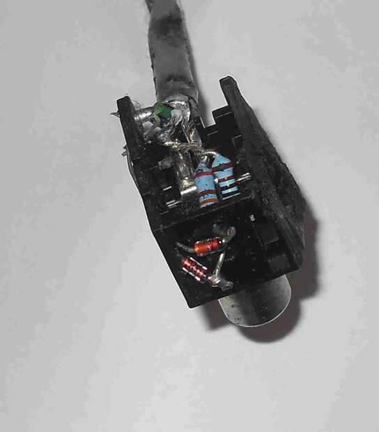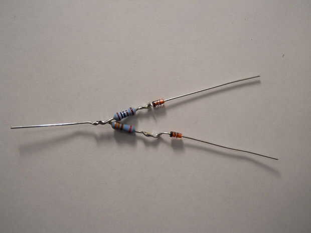 La soldadura de los extremos libres de las dos resistencias y el centro el plomo de su enchufe RCA junto.