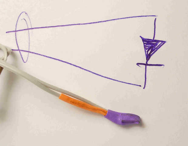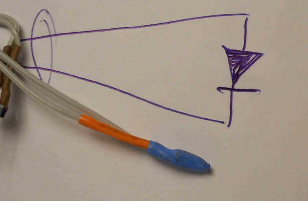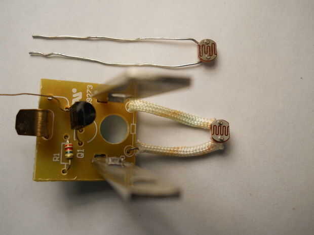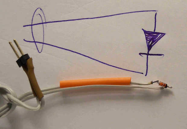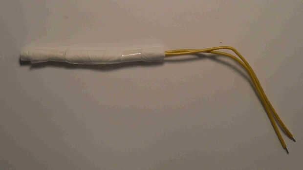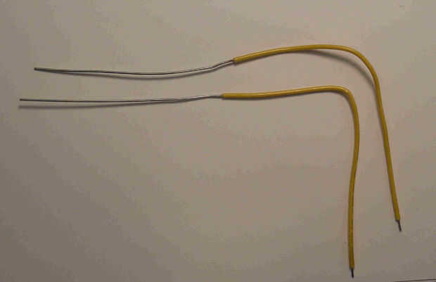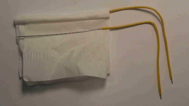 Los dos cables tienen varias pulgadas de aislamiento removido. Uno es envuelto en la mitad del papel higiénico. El otro cable se coloca al lado de él y la pareja está envueltos en el resto del papel higiénico. Mantener en su lugar con una pequeña cantidad de cinta. Totalmente mojado con una solución fuerte de agua de azúcar o sal y dejar secar. Después del secado puede que necesite reemplazar la cinta. Ahora es un sensor de humedad cuya resistencia cambia varios órdenes de magnitud con una sola gota de agua.
