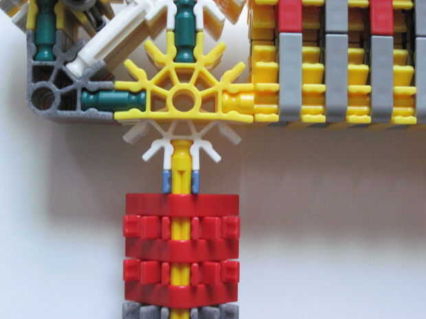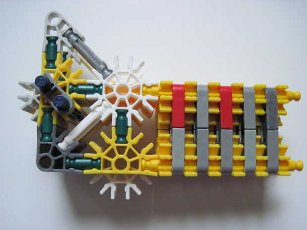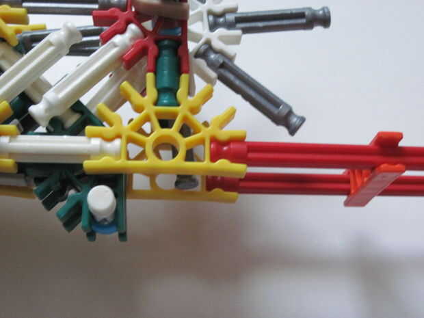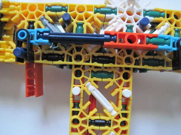 este es mi MSMG (Masterdude Sub Machine Gun). Tiene un gatillo de verdad y como la mayoría de mis armas es semi automatico (hay cierta controversia sobre el semi-auto término pero segun me K'nex que significa que cada vez que el gatillo se dispara un
