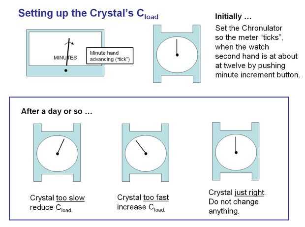 Si los relojes han perdido sincronización, ajuste C_load capacitancia cambiando una de las líneas comentadas anteriormente en el programa c y comentando la configuración que estaba en uso. Si su reloj estándar está por delante de la Chronulator, el Chronulator es lento. Disminuir el valor de la capacitancia. Si su reloj estándar está detrás de la Chronulator, la Chronulater es rápida. Aumentar el valor de la capacitancia.