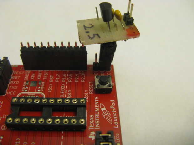 Mientras yo me la Chronulator, terminé construyendo unos artilugios útiles. No son necesarios, pero les he encontrado utilidad. También pueden ser utilizados en otra vez en otros proyectos de Launchpad que usan pilas y requieren un voltaje regulado. Los aparatos consisten en un pequeño 2.5V regulador que puede ser puesto en el Launchpad, paquete de una línea de energía de la batería para el regulador, y un super pegado bloque de 5 puentes para poner y quitar los puentes en el Launchpad. El esquema para el regulador poco superpuesto es igual a la fuente de alimentación que se muestra en el paso 2.